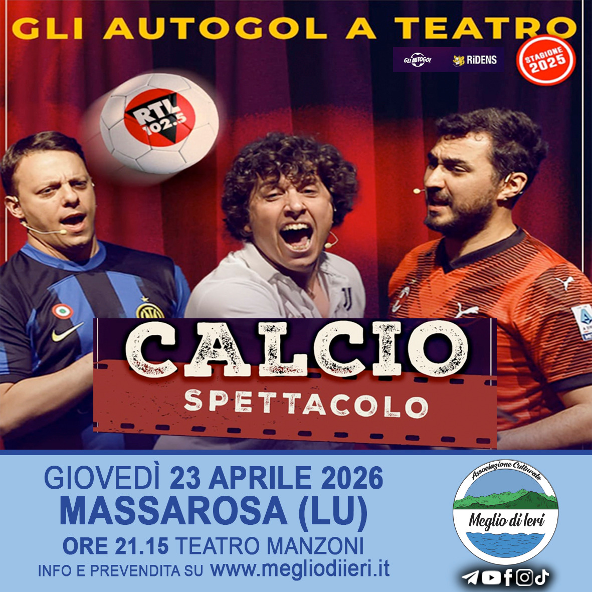 Gli Autogol, il trio comico sportivo con uno spettacolo tutto da ridere. Ambientato in uno spogliatoio, Alessandro, Michele e Rollo, alterneranno le loro gag più iconiche ai luoghi comuni che ogni ragazzo vive prima di una partita di calcetto con gli amici o prima del trendissimo paddle. E poi le parodie, quelle più amate dal pubblico del web, senza dimenticare le imitazioni di giocatori e allenatori della Serie A.